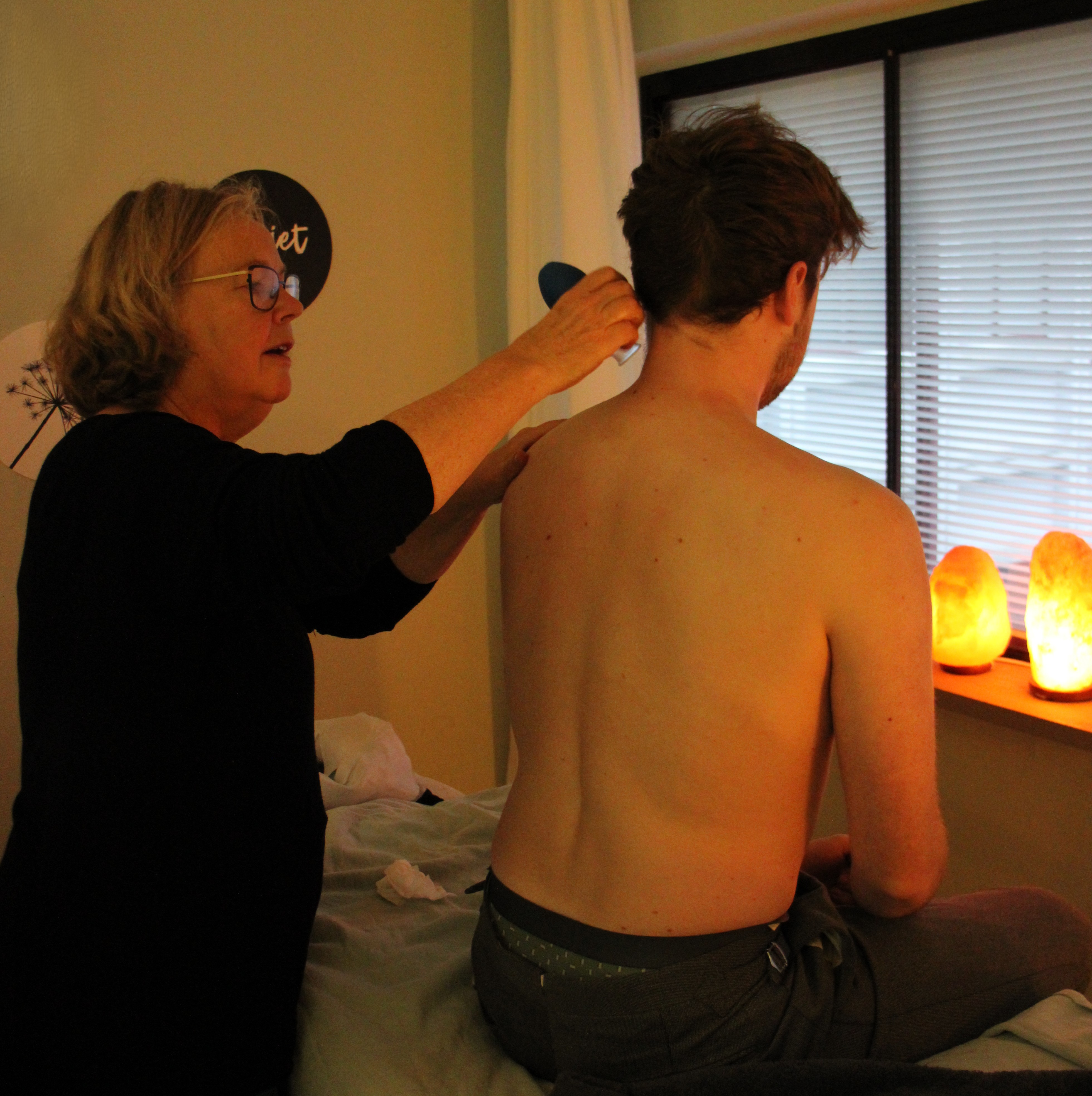 Met cups trek ik de huid vacuüm en door de cup te bewegen komen de blokkades los, zuurstofrijk bloed kan weer stromen en de afvalstoffen afvoeren.